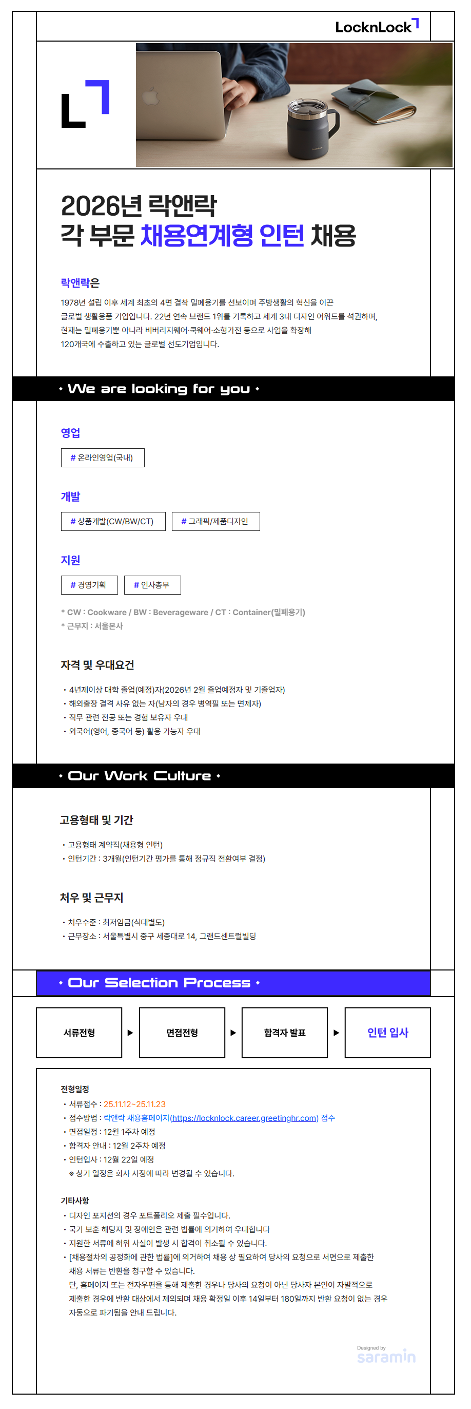 취업게시판 HOME 취업&진로 취업게시판 프린트 취업게시판 상세보기, 제목, 내용, 파일, 작성자등의 정보를 제공합니다. 제목 [락앤락] 2026년 락앤락 채용 연계형 인턴십 채용 (~11/23) 사진 확대보기 png 파일 참조 파일 2026년 락앤락 채용 연계형 인턴십 채용 .png 작성자 박해원 (영어영문학과) 목록 다음글 [당근마켓] Recruiting Intern (채용 전환형) (~11/26)