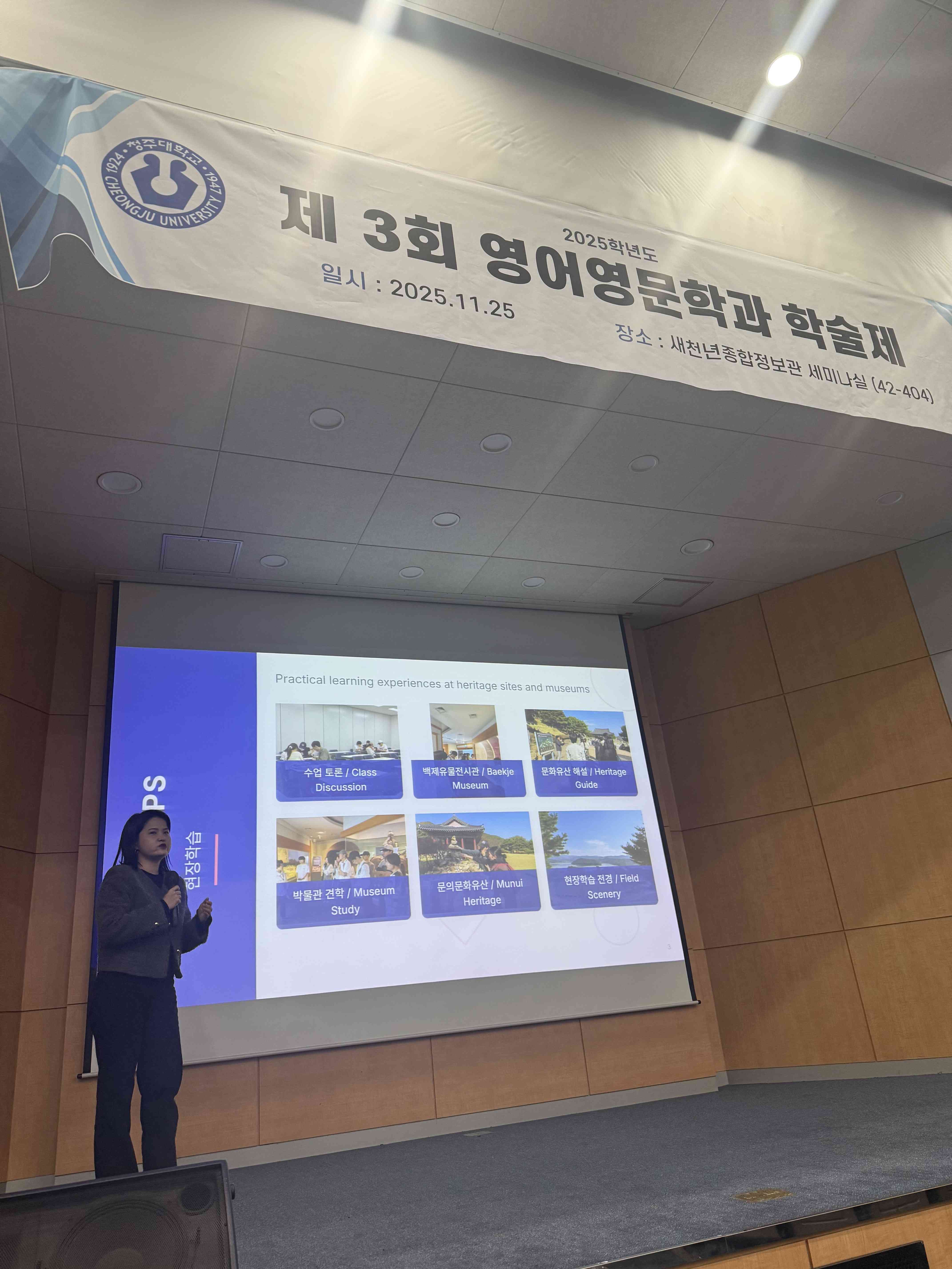 최우수상을 수상한 이유찬·신정훈 학생은 짝선배·짝후배 학과 프로그램 참여 경험을 소개하며 학과 내 멘토링 활동의 의미와 후배들에게 전하고 싶은 조언을 나누었습니다. 우수상을 수상한 임은주 학생은 2025 하계 글로벌 해외연수 및 미국 인턴십 프로그램에 참여한 경험을 공유하며, 현지에서 어떤 업무를 했는지와 그 과정에서의 느낀점 등을 들려주었습니다. 장려상을 수상한 조예림·이지현 학생은 <영어발음분석>교과목의 주요 실습 내용을 소개하는 발표를 하였습니다. 세 팀의 발표 이후에는 배수영 교수님께서 2025학년도 2학기에 신설된 <취업실전영어–캡스톤 프로젝트> 교과목의 주요 학습 내용과 실제 진로 준비와의 연계성을 소개해 주셨으며, 이어 학생회에서 준비한 학과 관련 퀴즈 이벤트가 진행되어 즐겁게 마무리되었습니다. 이번 학술제는 전공을 기반으로 한 학습 경험뿐만 아니라 학과 프로그램을 통해 느낀 소통과 성장의 순간들을 함께 나눌 수 있었던 풍성한 자리였으며 따뜻한 격려 속에서 마무리된 이번 행사가 앞으로의 학과 활동에도 밝고 긍정적인 활력을 더해줄 것으로 기대됩니다. https://www.youtube.com/shorts/0Q4gow6c92E |