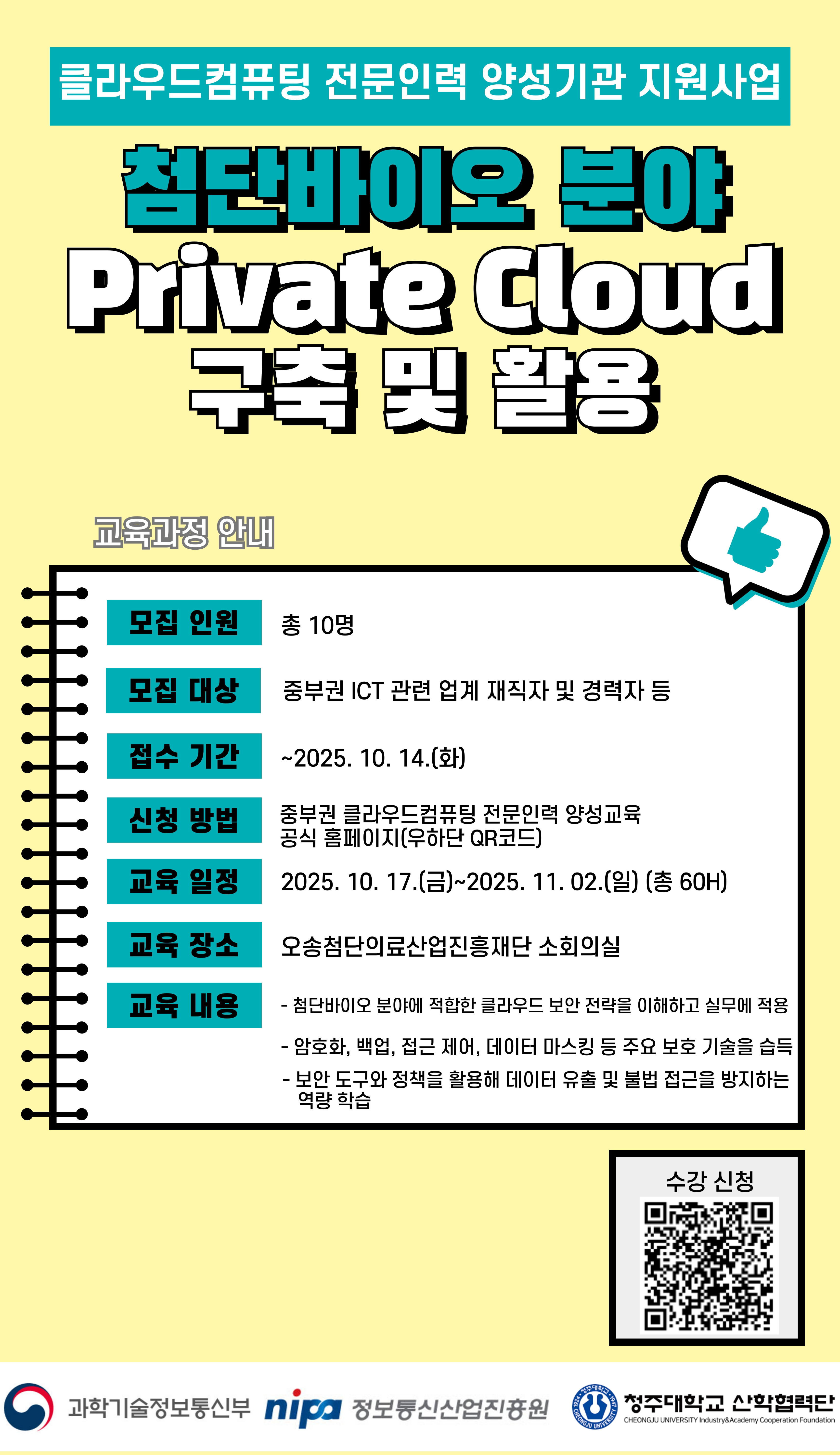 중부권 ICT 관련 업계 재직자 및 경력자 등 🍀모집 기간 ~25. 10. 14.(화) 🍀모집 인원 10명 🍀접수 방법 https://cloud-cjuiacf.co.kr/ →회원가입 후 해당 과정 신청 🔎문의처 청주대학교 클라우드사업단 ☎ 043-229-7915 |