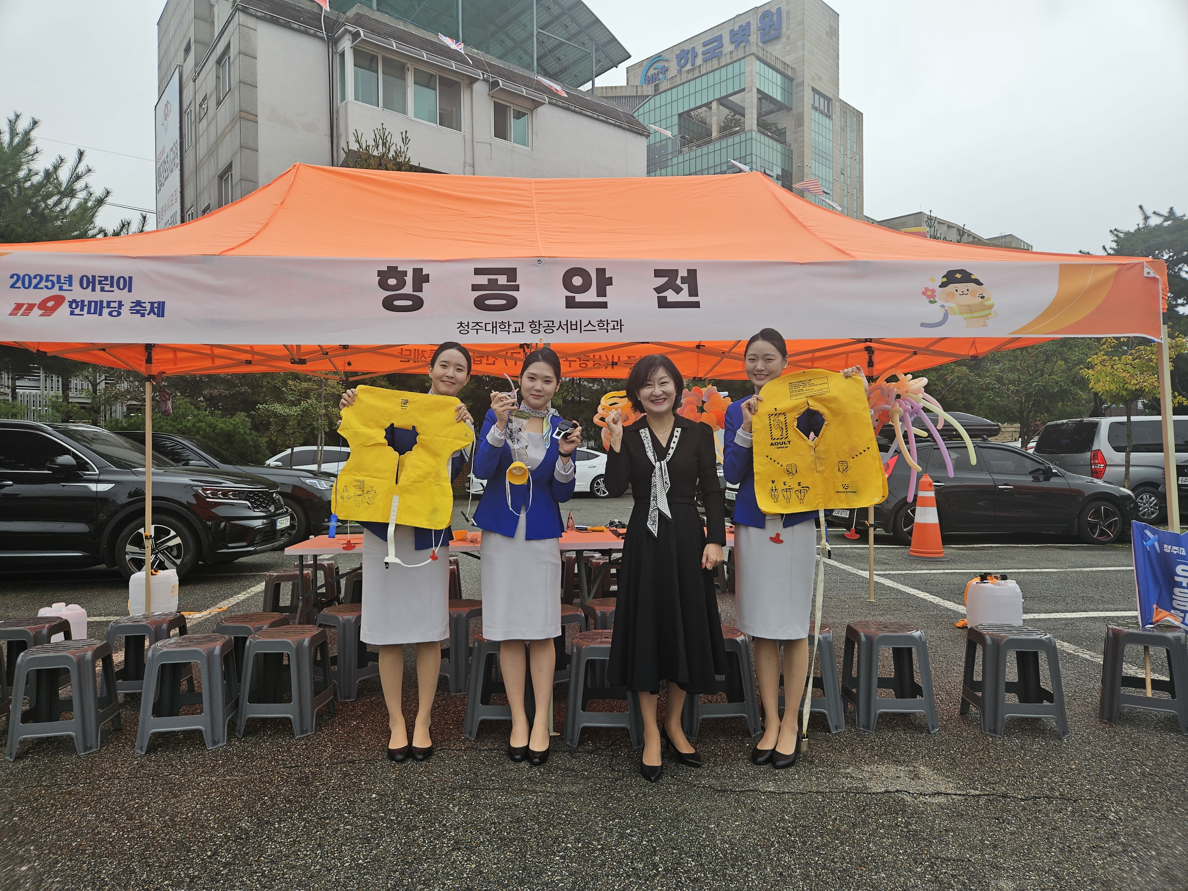 청주대에 따르면 이날 청주대 항공서비스학과 윤성주 교수와 2학년 고나현, 전상미, 홍채화 학생 등은 청주동부소방서에서 개최된 ‘2025 어린이 119 한마당 축제'에 참여해 어린이들을 대상으로 항공안전 체험 프로그램을 운영했다.